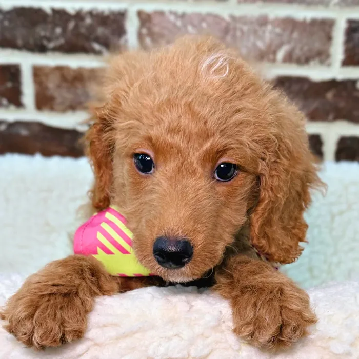 Hey! I am a Female Mini Goldendoodle. I was born on February 11, 2025. I am vaccinated and dewormed up to date, microchipped and ready for my new forever home! If you would like to come to Shake A Paw Union for a puppy play date, give us a call at 908-688-2600!